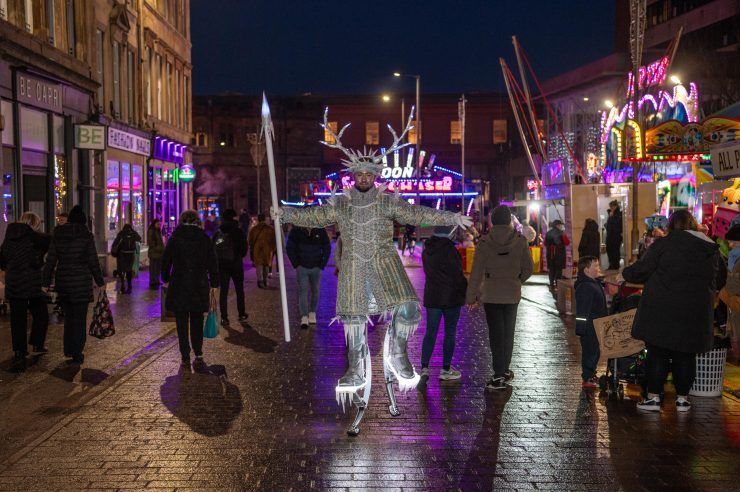 - Festive characters will be wandering through the town centre including Jack Frost on stilts and giant illuminated characters such as Santa and an elf.