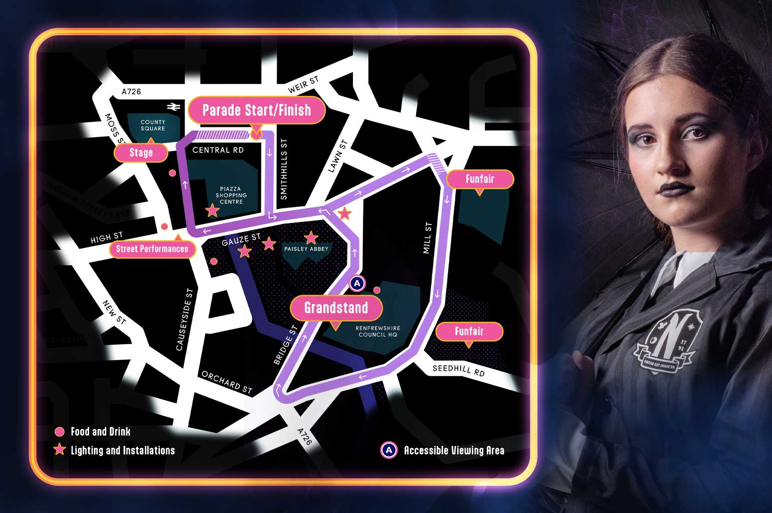 Please note the grandstand seating is not accessible. An accessible viewing area is available next to the seating area. Please contact events@renfrewshire.gov.uk for more information on accessible viewing.